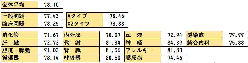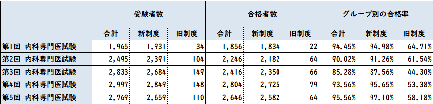 | 受験申込者数 | 2,793名(うち24名が欠席・辞退) ;J-OSLERを利用している新制度研修者 2,676名 ;認定内科医 取得済み(病歴要約免除) 63名 ;認定内科医 資格喪失による受験(病歴要約免除) 6名 ;認定内科医試験で病歴要約のみ合格者(病歴要約免除) 31名 ;海外の内科専門医資格保持者(特にABIM) 3名 ;旧世代で、認定内科医資格なし(病歴要約29症例必要) 14名 |